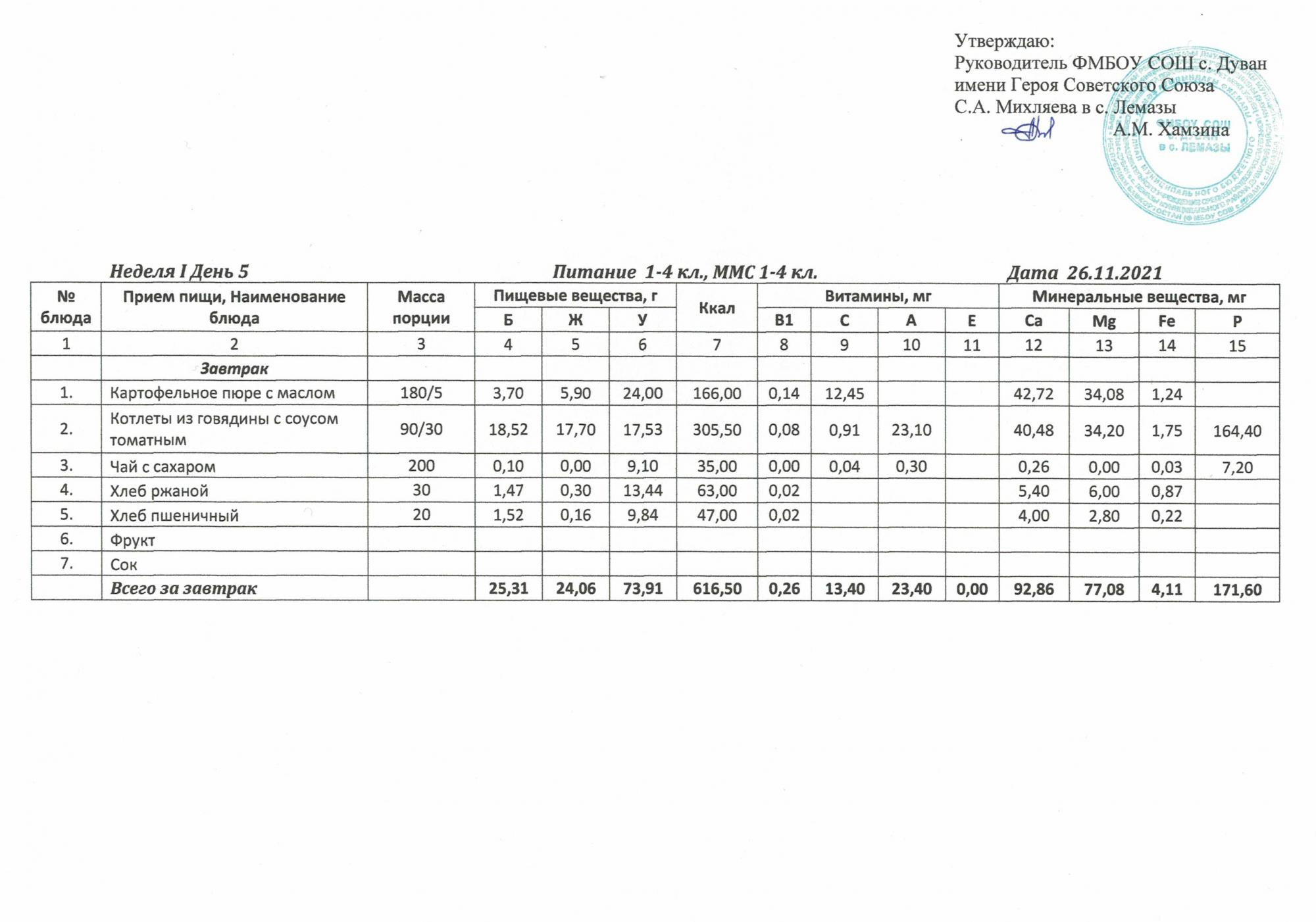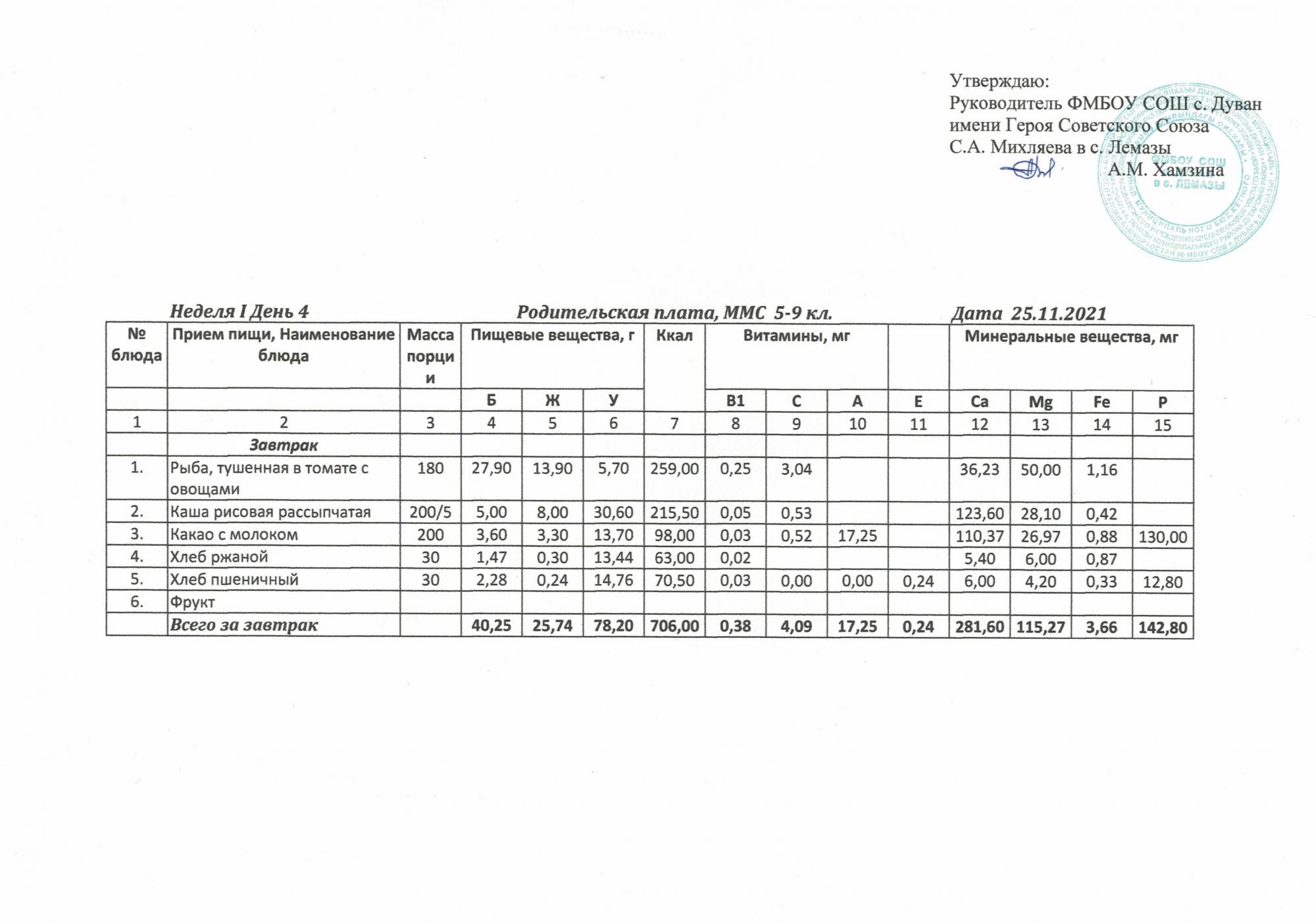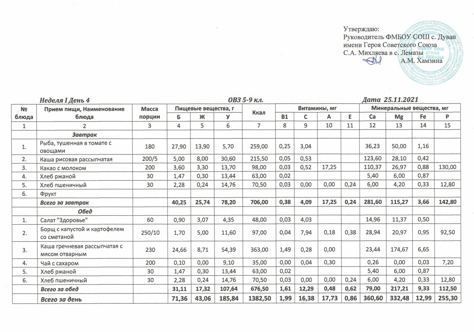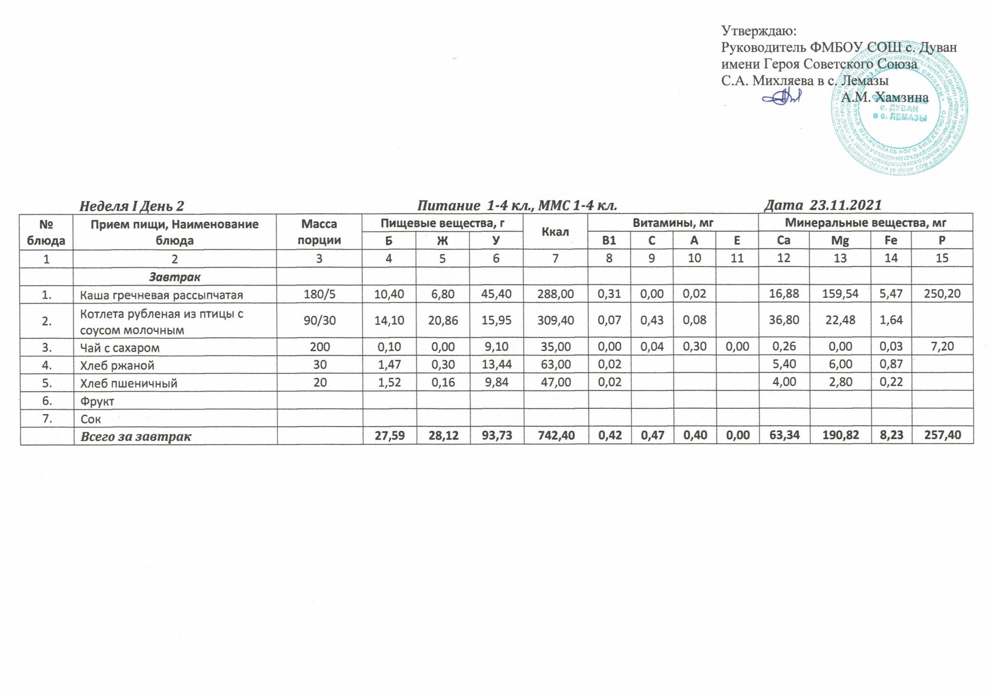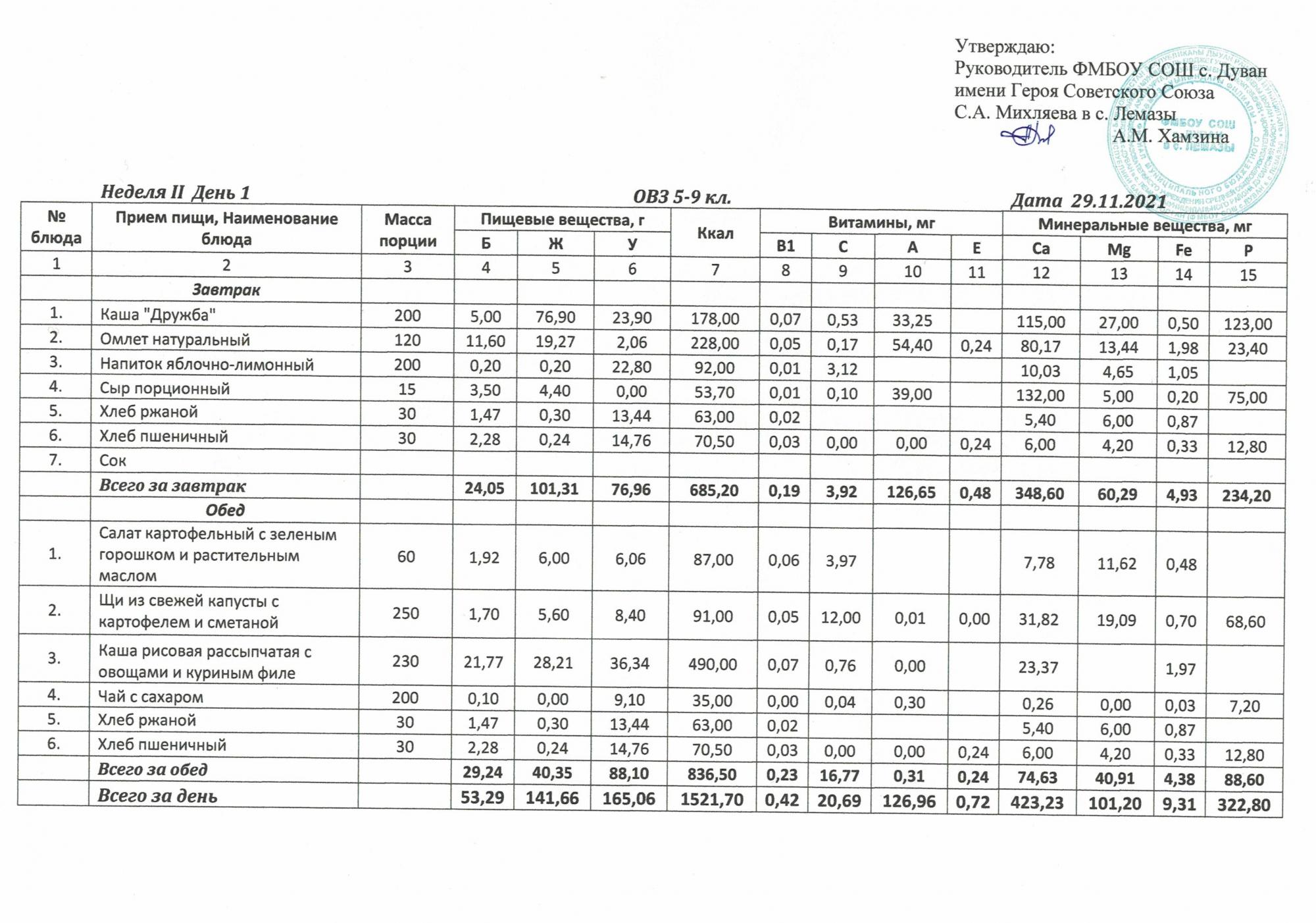 Утверждённое ежедневное меню и фото