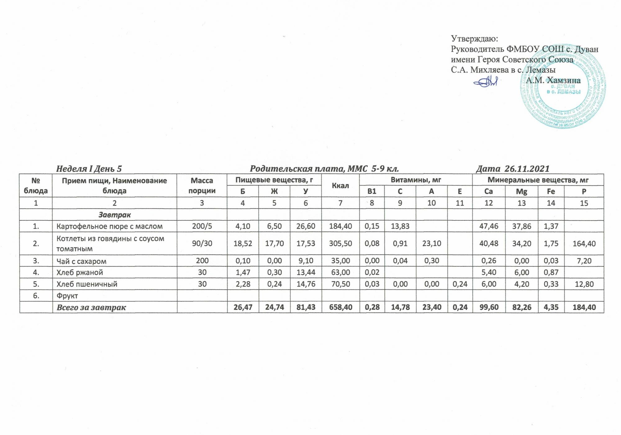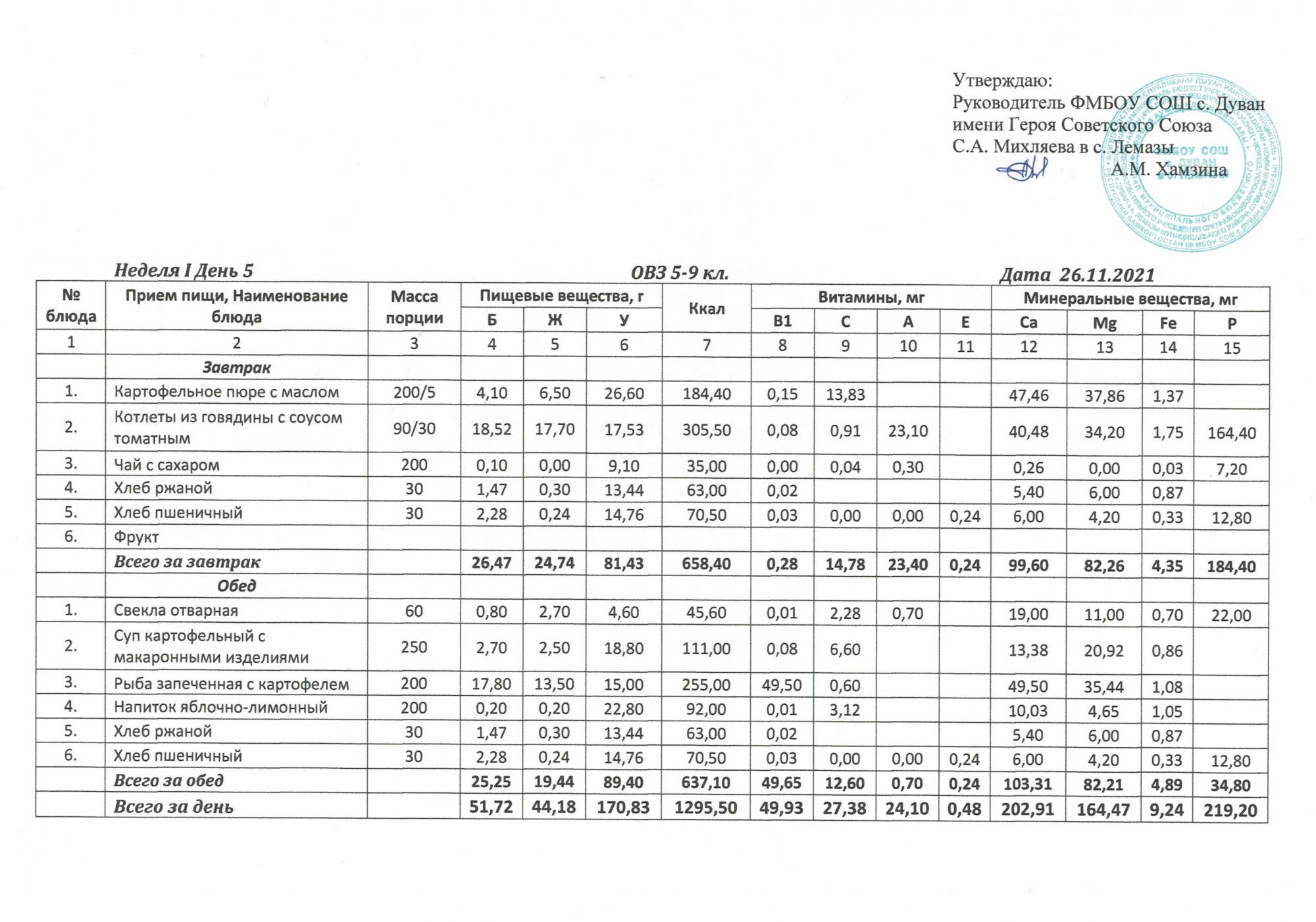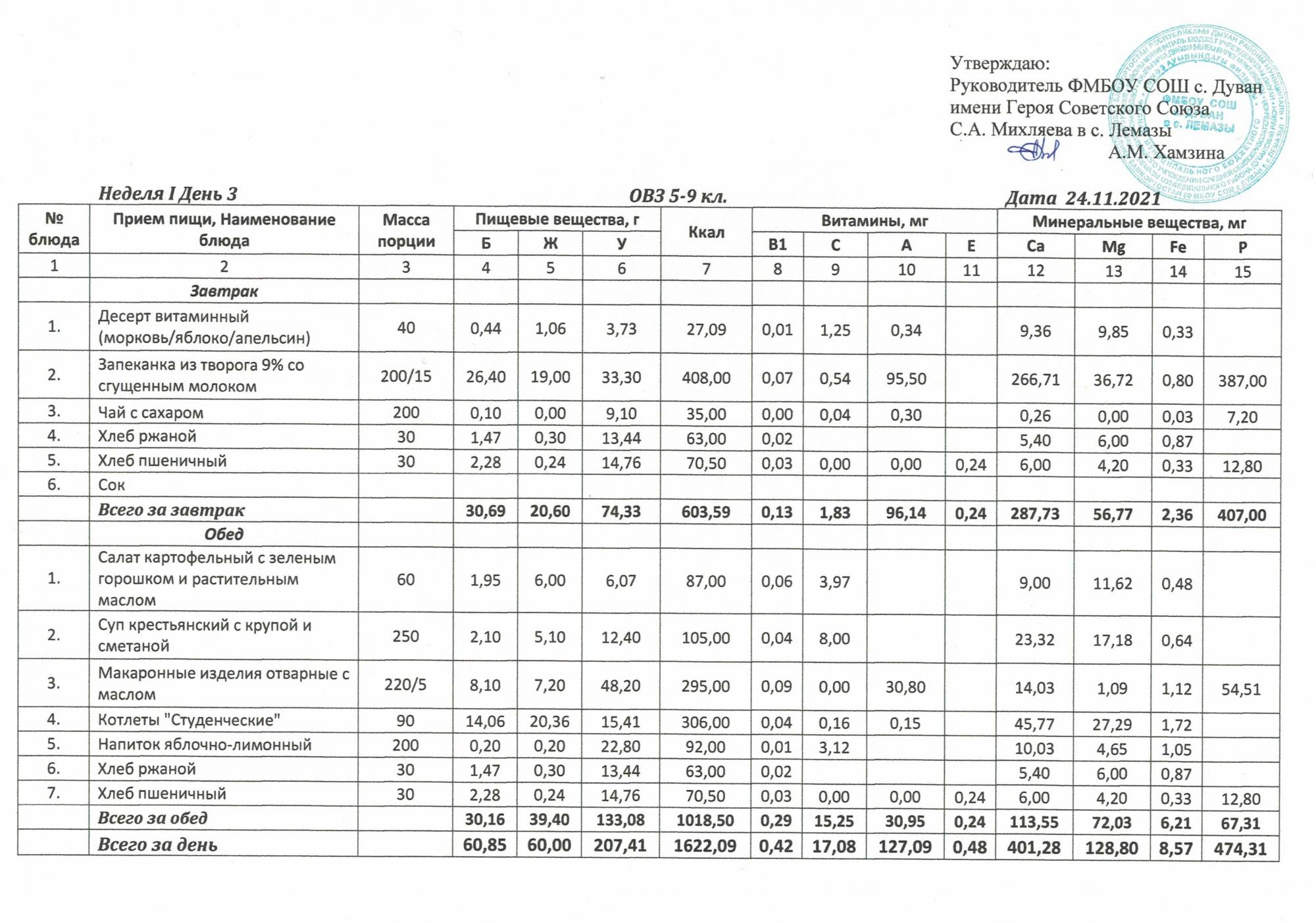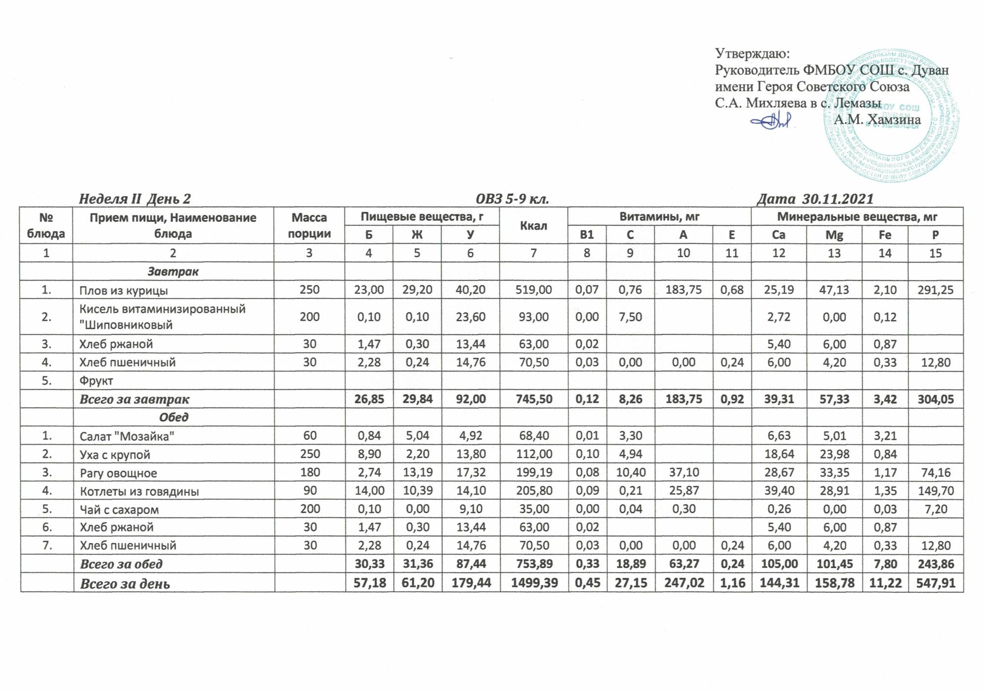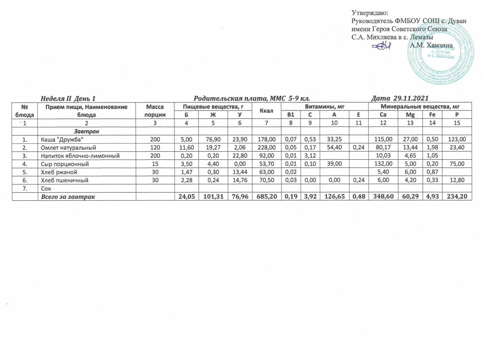 Утверждённое ежедневное меню и фото