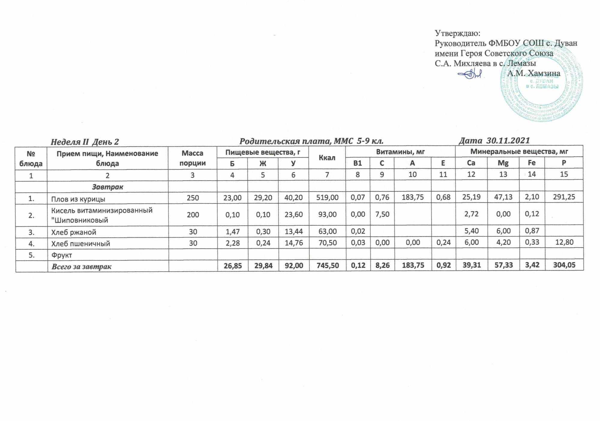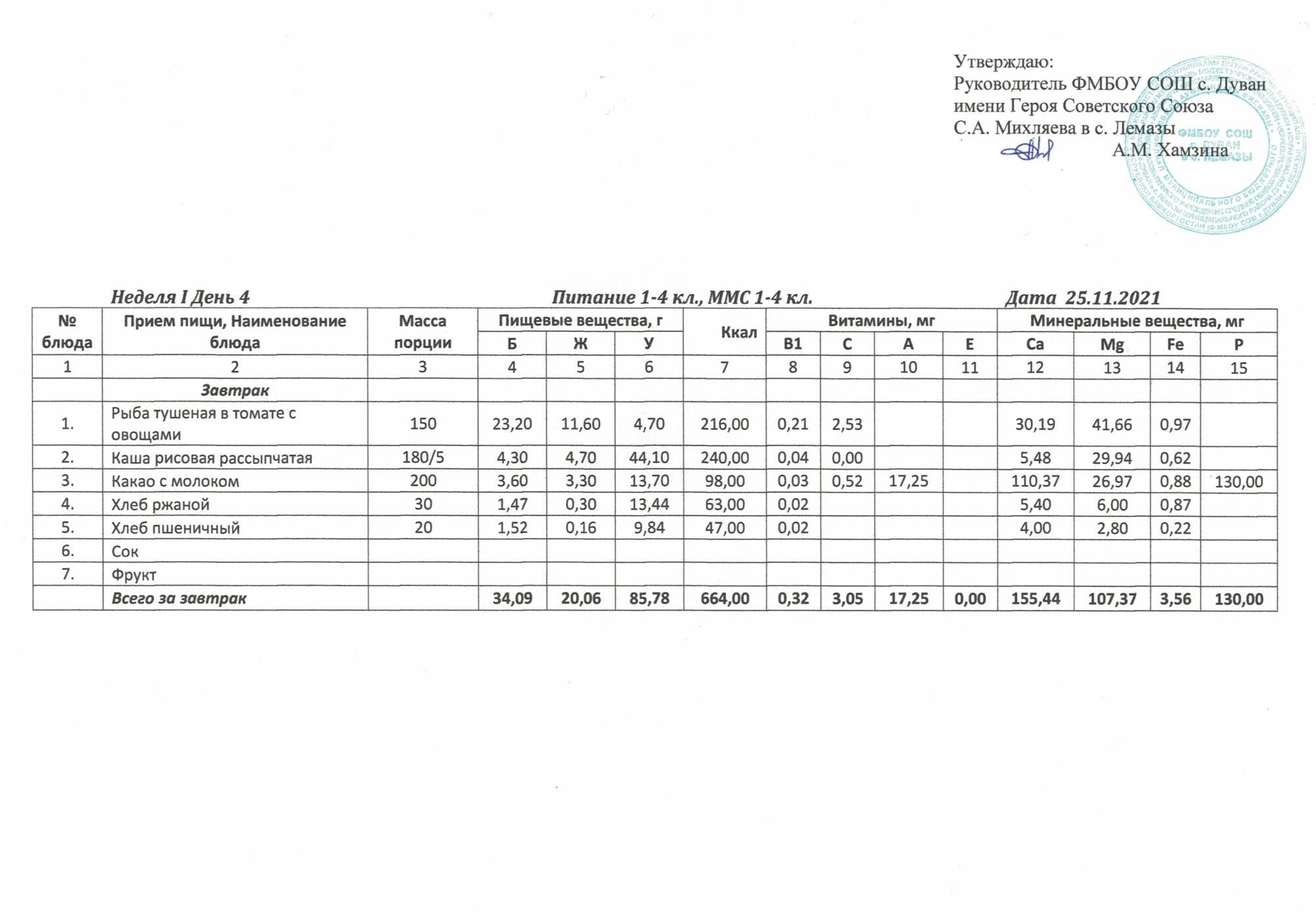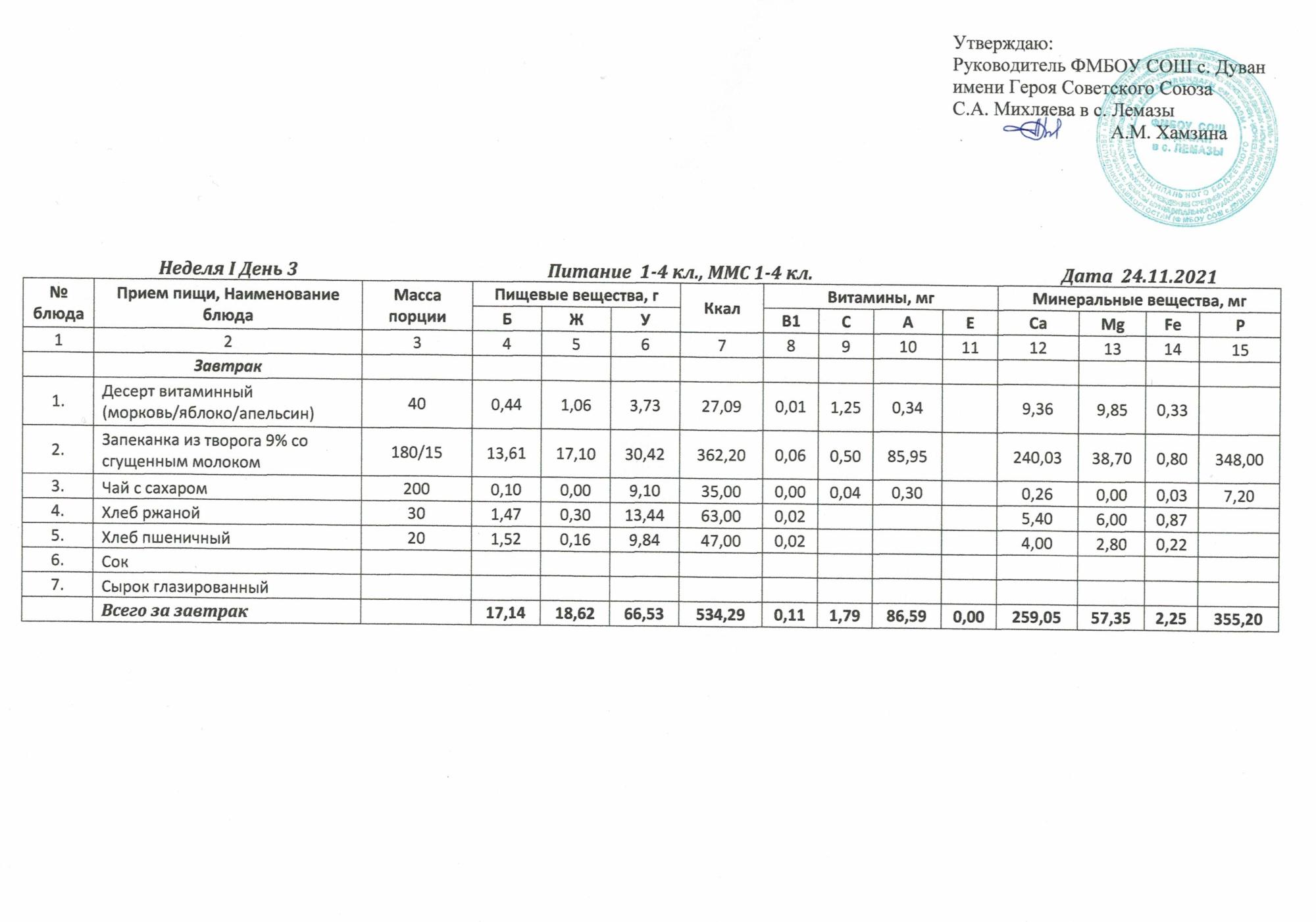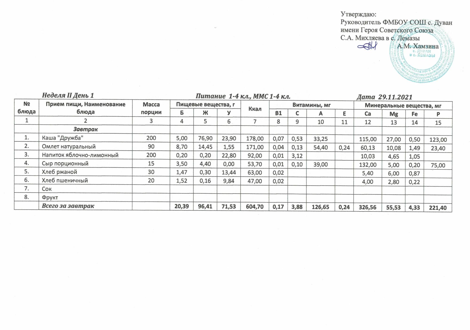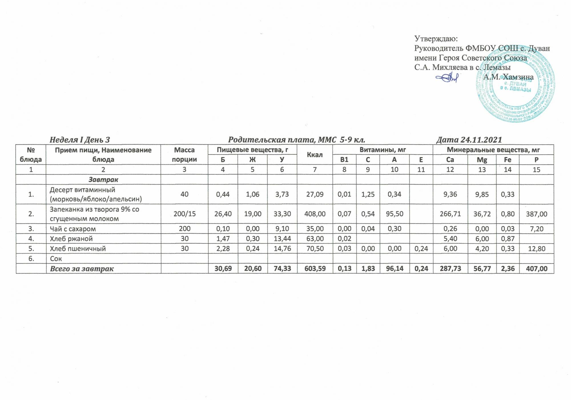 Утверждённое ежедневное меню и фото