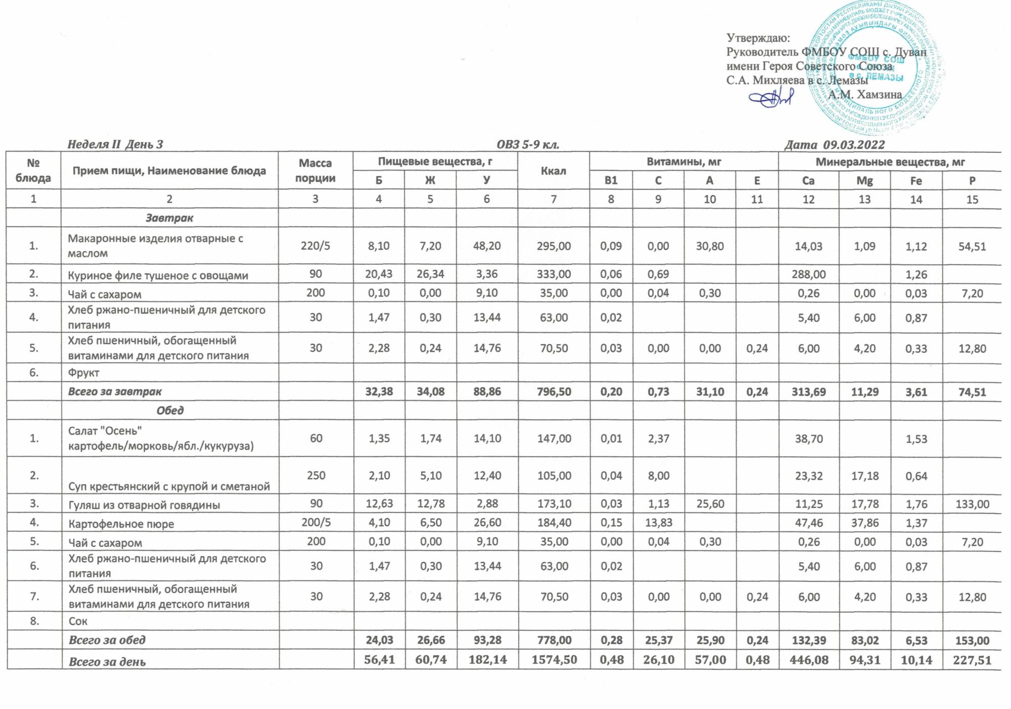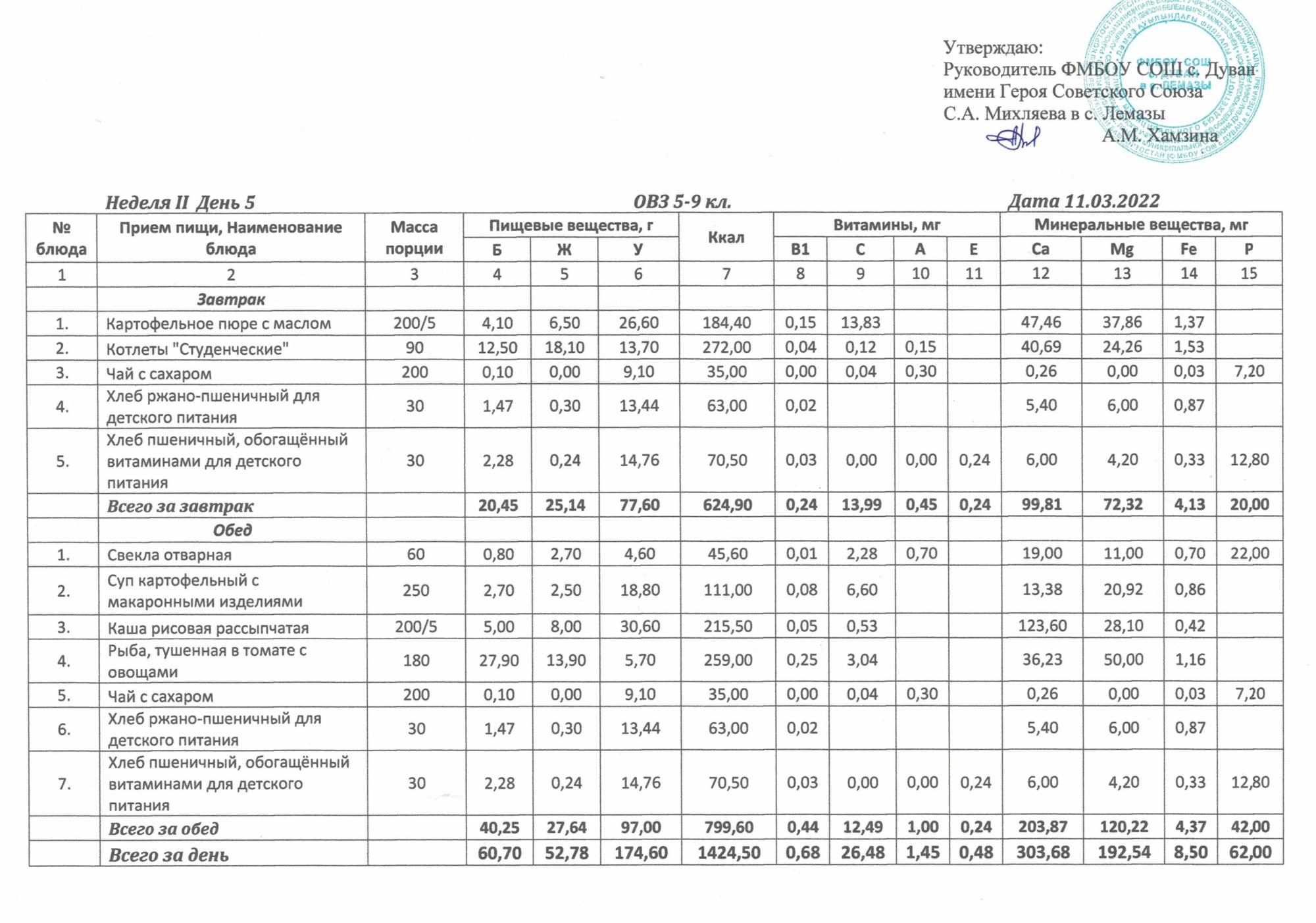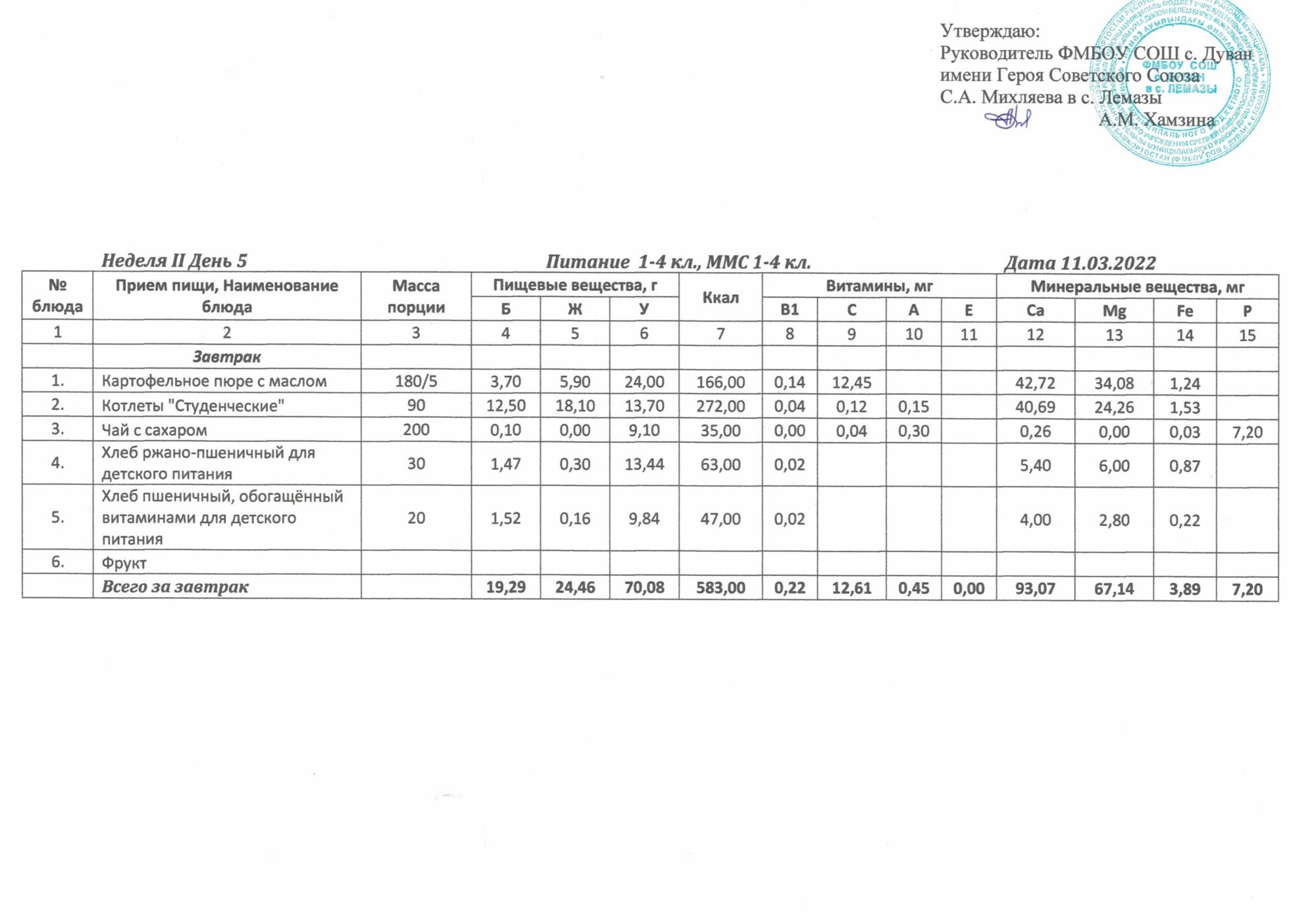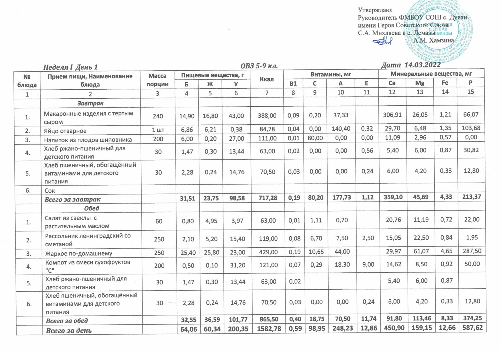 Утверждённое ежедневное меню и фото