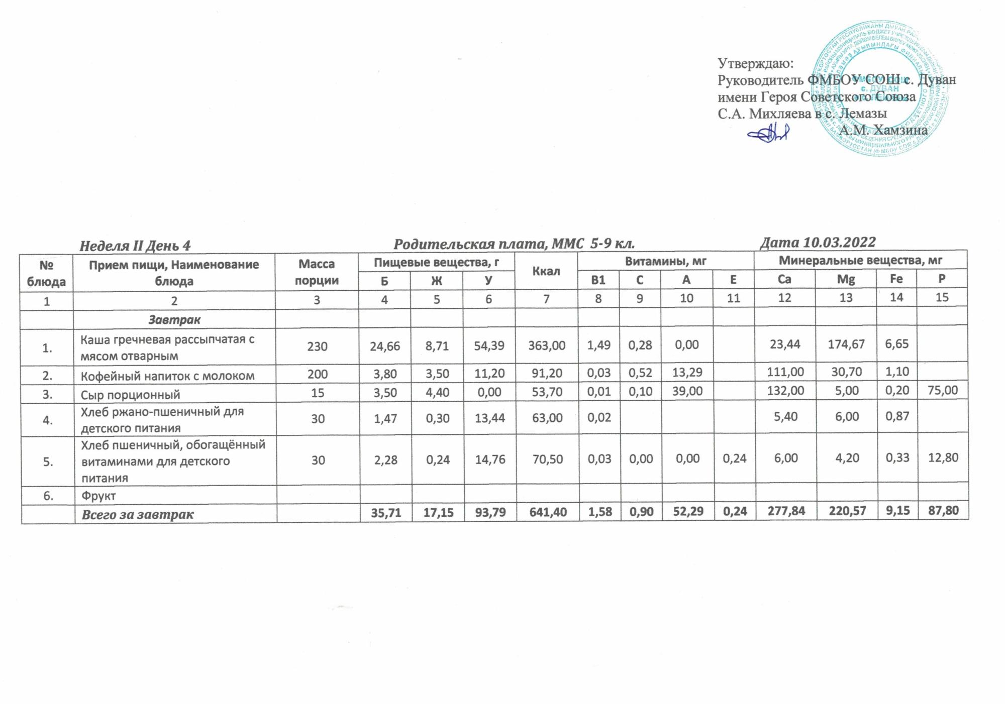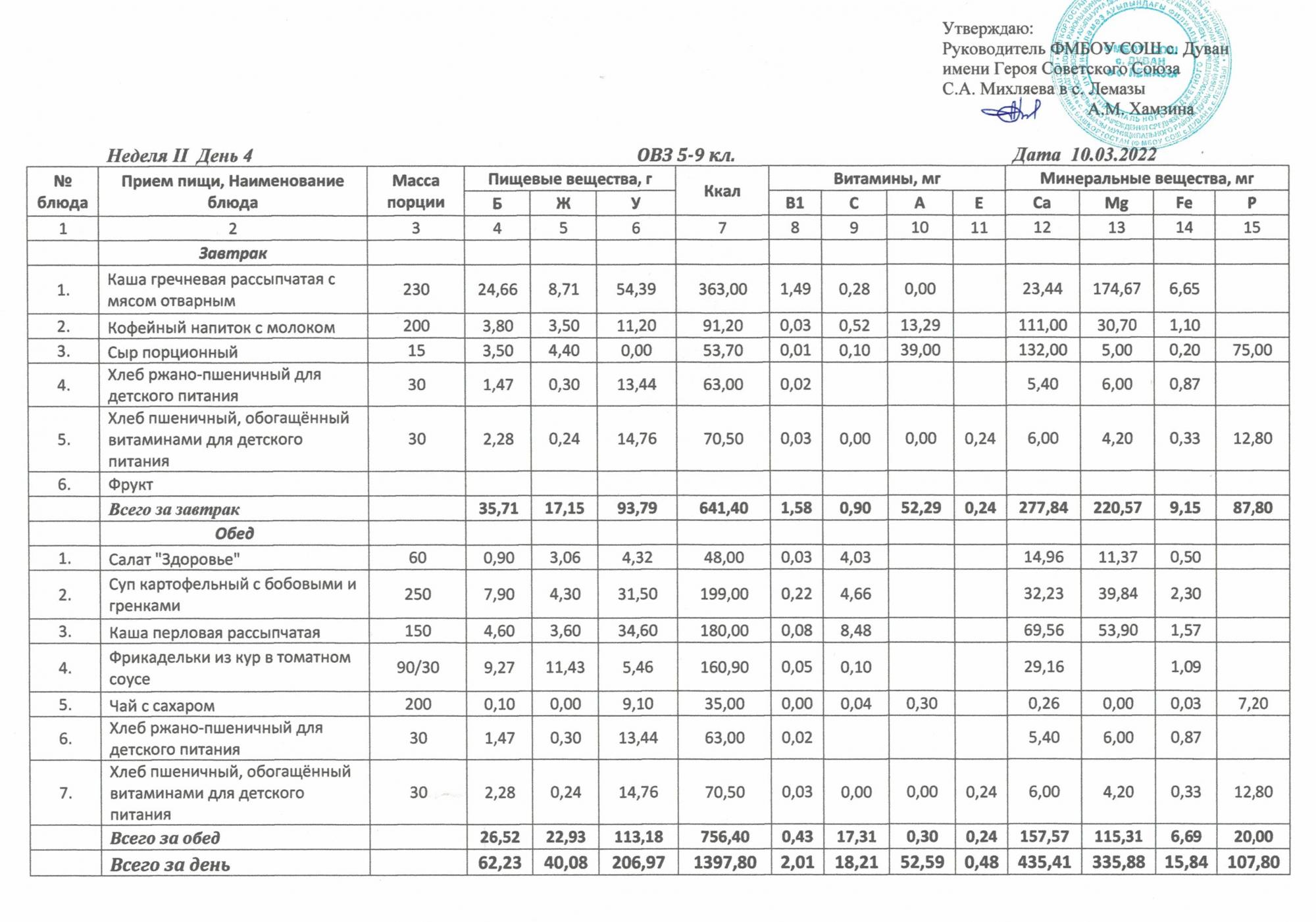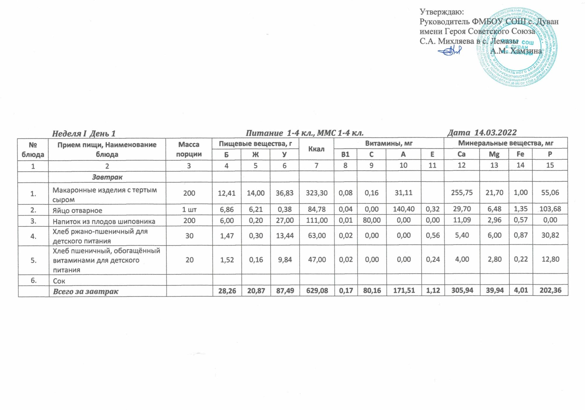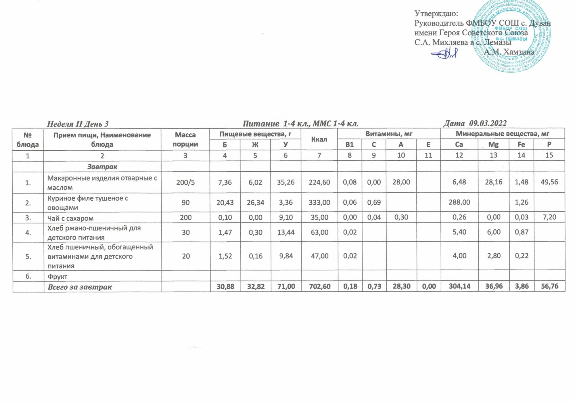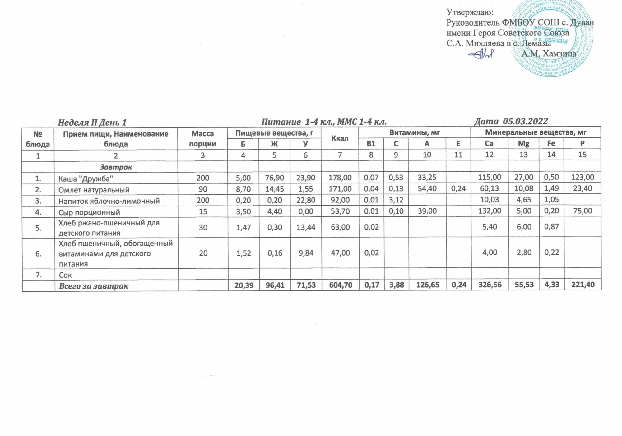 Утверждённое ежедневное меню и фото